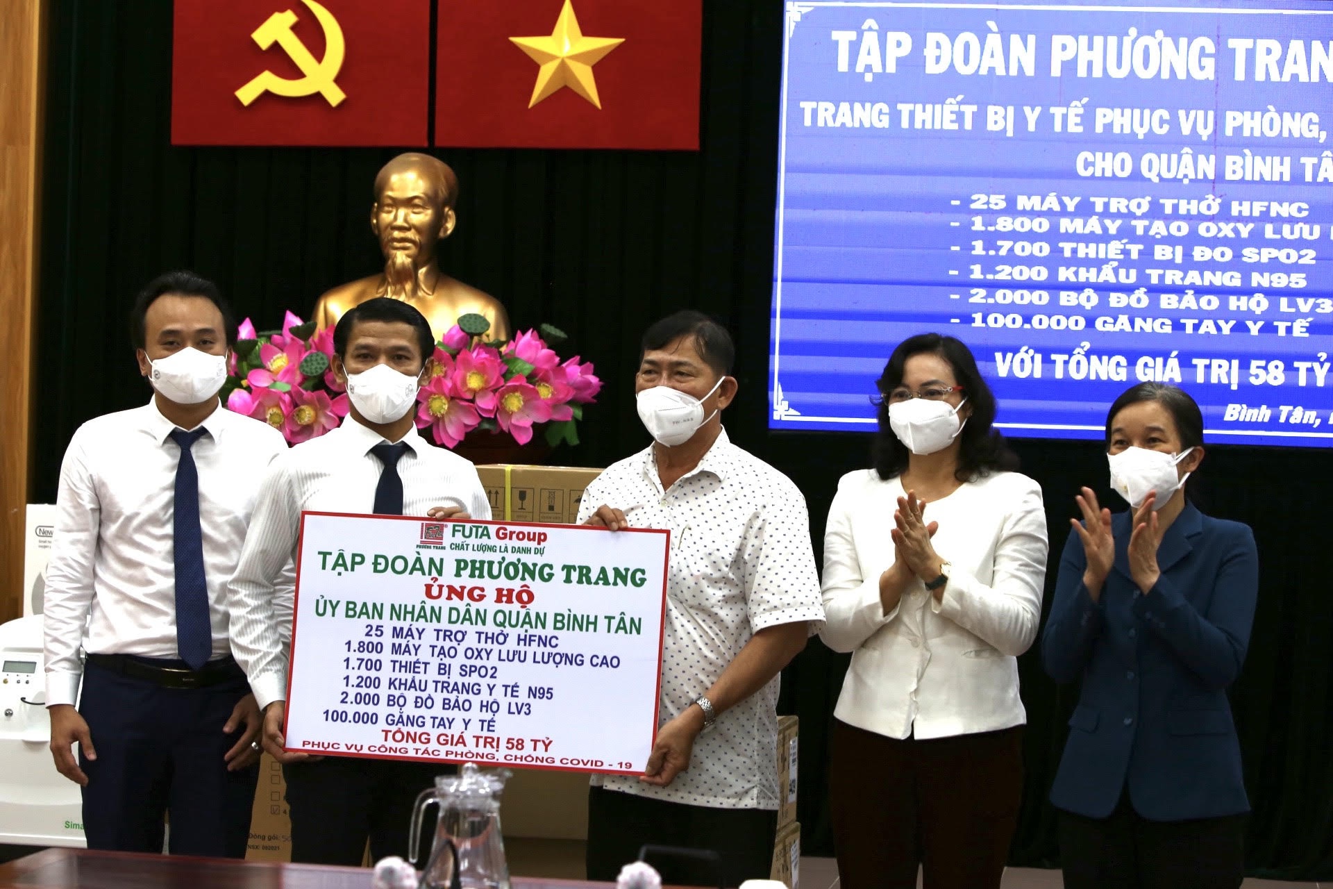 Tại buổi lễ, ông Đào Viết Ánh, Phó tổng giám đốc Công ty CP xe khách Phương Trang - Futa BusLines (đại diện Tập đoàn Phương Trang) đã trao tặng Q.Bình Tân 4 xe tải trang thiết bị y tế, bao gồm 25 máy trợ thở HFNC, 1.800 máy tạo ô xy lưu lượng cao, 1.700 thiết bị đo ô xy trong máu SpO2, 1.200 khẩu trang y tế N95, 2.000 bộ đồ bảo hộ lao động và 100.000 găng tay y tế, tổng trị giá 58 tỉ đồng.