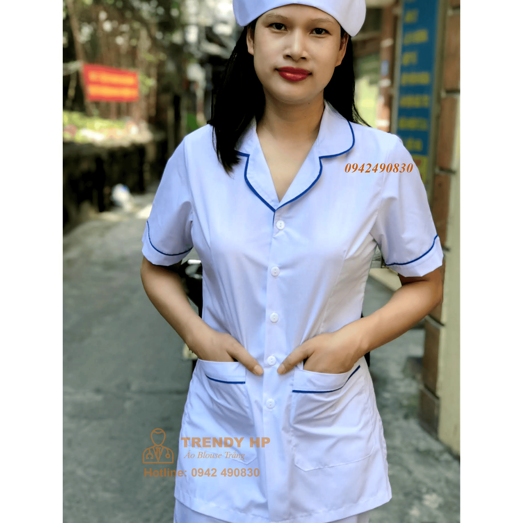 Áo blouse trắng có viền xanh điều dưỡng